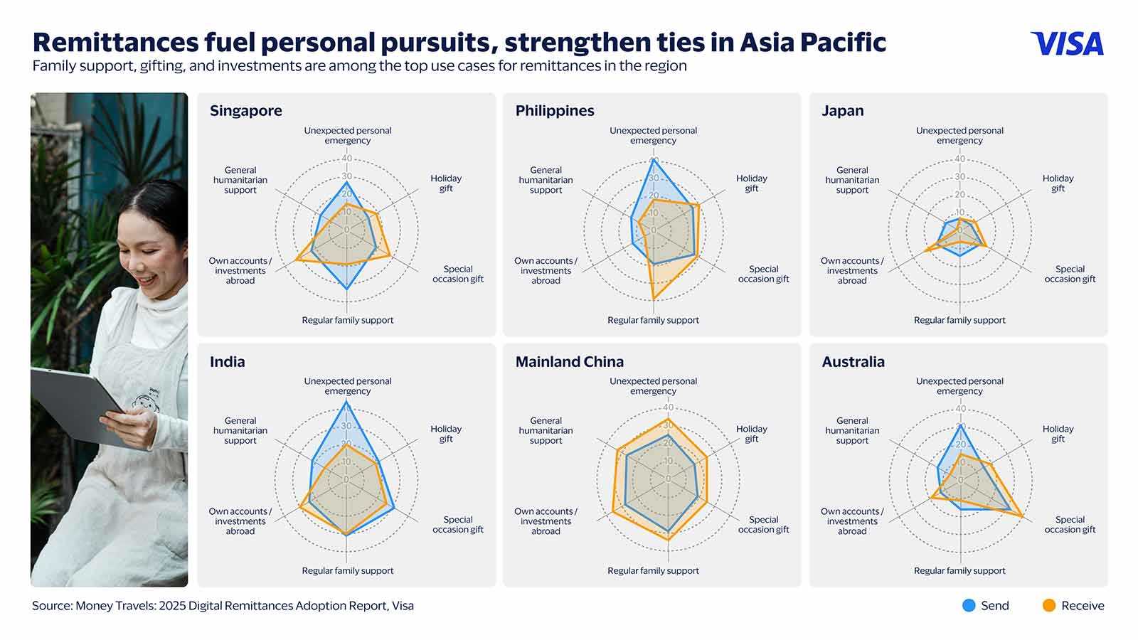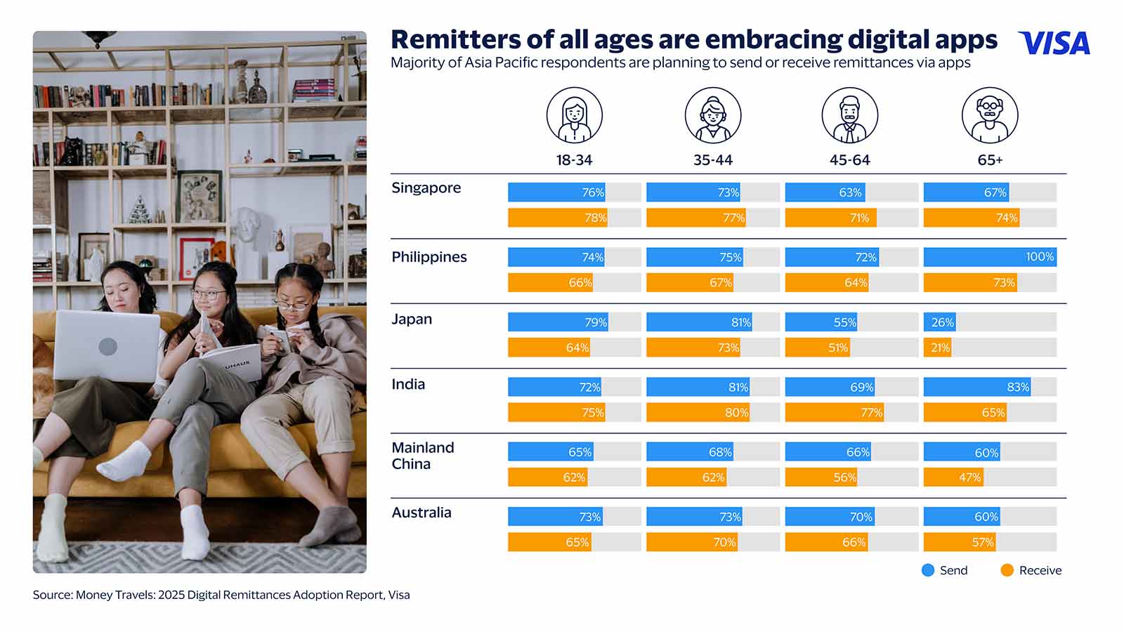 With remittances growing by 4.6% globally to US$905 billion in 2024², how communities in Asia Pacific perceive and use remittances is undergoing a clear digital inflection. According to Visa’s Money Travels: 2025 Digital Remittances Adoption Report, digital apps are now the most widely used way to send and receiving money among over 25,000 respondents across six surveyed markets in Asia Pacific: Australia, India, Japan, Mainland China, the Philippines, Singapore, ahead of cash-and-check and other forms of digital remittances.