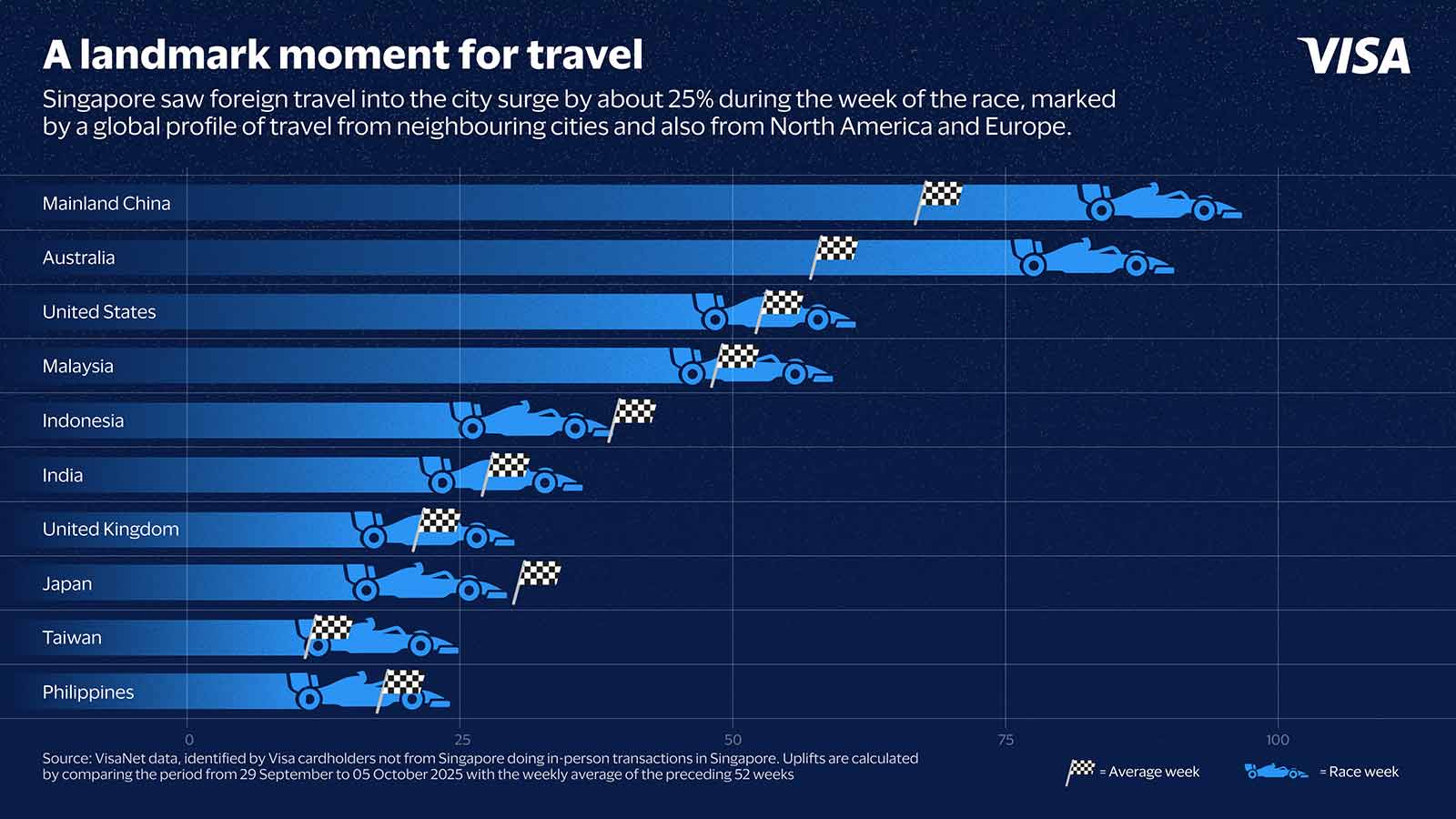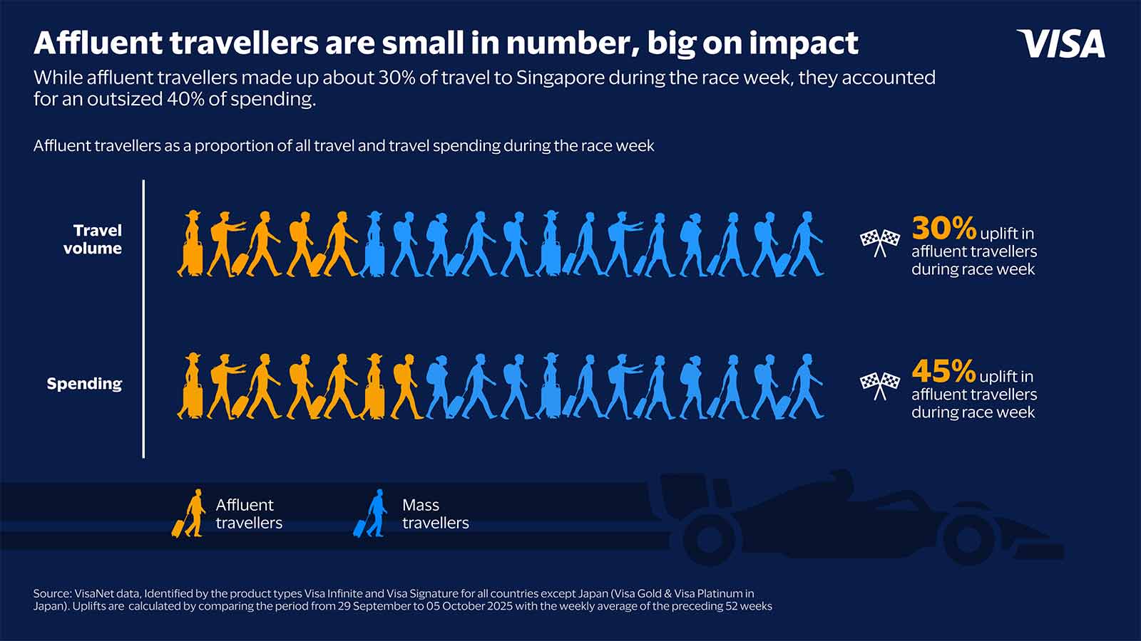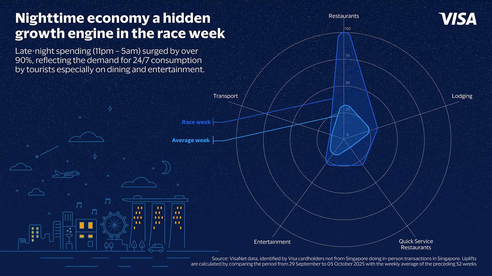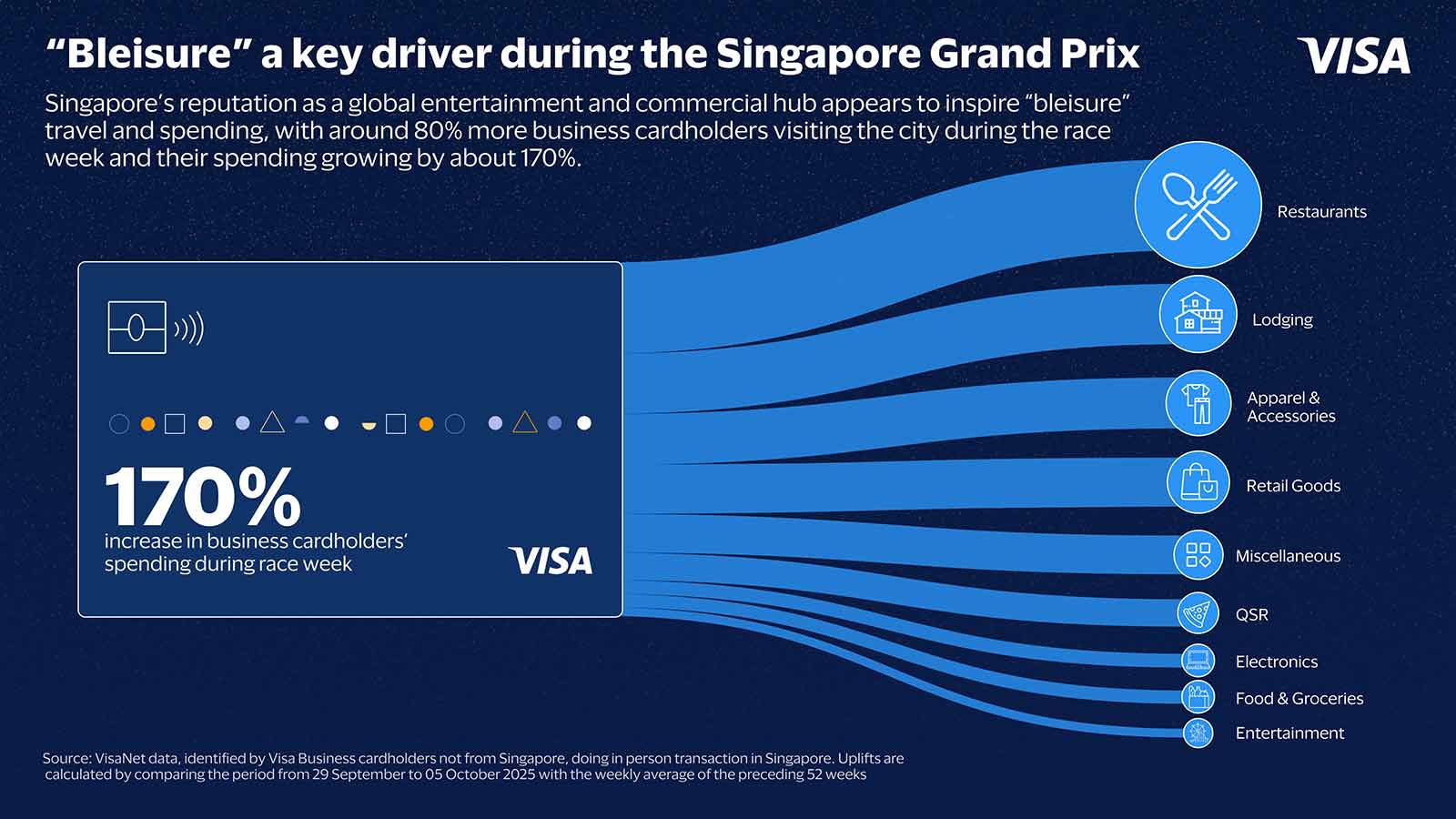 Disclaimer: Visa has no commercial affiliation or sponsorship relationship with Formula 1TM. All insights and data provided are based on VisaNet data from 29 September to 5 October 2025 during the week of the Singapore Grand Prix.